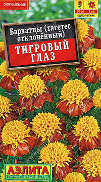 Бархатцы Тигровый глаз (отклонённые) Отлично подходят для выращивания в горшках на окнах и балконных ящиках. Прекрасно смотрятся на клумбах и в бордюрах. Цветение очень раннее, обильное и продолжительное. Кусты пышные, высотой до 30 см, сильно ветвятся, с большим количеством цветоносов. Соцветия крупные, махровые, диаметром 6 см, красивой двухцветной окраски. Растения неприхотливые, светолюбивые, засухоустойчивые. Отлично развиваются и цветут в маленьком объеме земли.