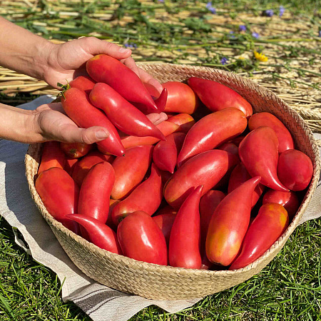 Сладкий и мясистый перцевидный помидор яркого алого цвета с изящным изогнутым носиком. Вкусовые качества отличные. Плоды практически не содержат сока, не склонны к растрескиванию, пригодны для вяления, заморозки и фаршировки. Сорт среднеспелый, очень урожайный, плодоносит до конца сентября. Устойчив к неблагоприятным условиям выращивания. Растение индетерминантное. Формируем в 2–3 стебля.