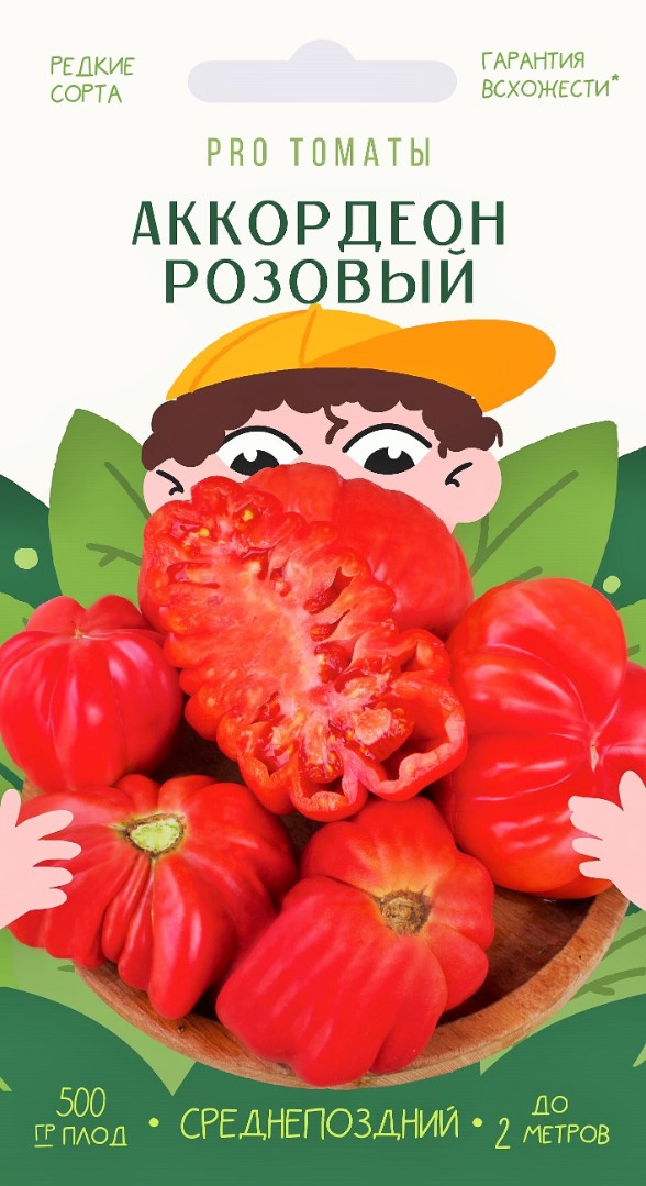 Среднепоздний. Теплолюбивый гофрированный сорт Pink Accordion родом из Мексики для тех, кто любит очень большие томаты! Похож на гармошку. Вес плода от 250 до 1000 грамм! Урожайность с 1 куста достигает 7 кг: он будто усыпан огромными цветами! Плоды от округлой до широко-грушевидной формы, очень красивые, сильно ребристые, розового или темно-малинового цвета. Мякоть мясистая, практически без пустот, сочная и ароматная. Во всех регионах России выращивается исключительно в теплицах, даже в южных. При хорошем уходе практически не болеет. Используют для фаршировки, приготовления различных соусов, сока, первых и вторых блюд, эффектно смотрится в нарезке. Плоды хранятся не дольше недели. Плодоношение длительное. Для рекордных урожаев надо приложить немало усилий и надеяться, что погода не подведет!