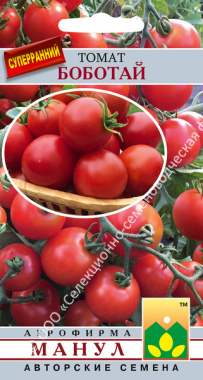 Томат Боботай– ультраскороспелый сорт, созревает на 72-75 день от всходов. Растения низкорослые, супердетерминантного типа, высотой 35-40 см. Идеально подходит для открытого грунта, временных укрытий, балконов, лоджий, для горшечной культуры. Растение среднеоблиственное. Лист горизонтально пониклый, средний, слабо гофрированный, обыкновенного типа, зелёного цвета. Соцветие простое, компактное, с 6-8 плодами. Соцветия располагаются через 1-2 листа или непосредственно друг за другом. После образования 3-х соцветий рост основного побега самоограничивается, и далее рост продолжает пасынок. Плоды округлой формы, гладкие, массой 35-40 г, с 2-3 семенными камерами, при созревании – красные, иногда красно-оранжевые. Вкусовые качества плодов хорошие; используются в свежем виде и для переработки.