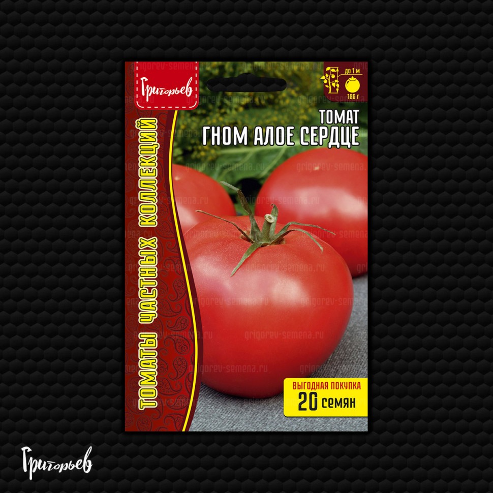 Этот детерминантный томат среднераннего созревания (100-115 дней) был создан в рамках проекта «Гном томатный». Он подходит для выращивания в открытом грунте, теплицах, а также в контейнерах на балконах и лоджиях. Компактный куст достигает высоты до 100 см. Он имеет крепкое строение и умеренную ветвистость. Плоды сердцевидной формы с небольшим носиком на вершине весят около 120-250 г. Зрелые томаты насыщенного алого цвета. Мякоть плотная, сочная, с небольшим количеством семян. Вкус сбалансированный, с выраженной сладостью и лёгкой кислинкой. Аромат насыщенный, характерный для томатов. При правильном уходе урожайность составляет 4-5 кг с куста. Сорт устойчив к основным заболеваниям томатов, особенно к фитофторозу. Плоды универсальны: их можно есть свежими, добавлять в салаты и закуски, готовить соки и соусы, консервировать кусочками или замораживать. Этот сорт станет отличным выбором для тех, кто ценит компактные растения с отличными вкусовыми качествами и неприхотливостью в уходе.