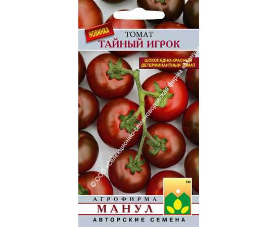 Томат Тайный игрок - среднего срока созревания. Предназначен для выращивания под пленочными укрытиями и в открытом грунте, для фермерских хозяйств и садово-огородных участков. Растения детерминантного типа роста. Первое соцветие формируется над 7-8-м листом, последующие расположены через 1-2 листа. После образования 3-5 соцветий рост основного побега само ограничивается, и рост продолжает пасынок. Облиственность растения средняя. Соцветие среднее, простое, компактное, с 5-6 плодами округлой и плоскоокруглой формы.