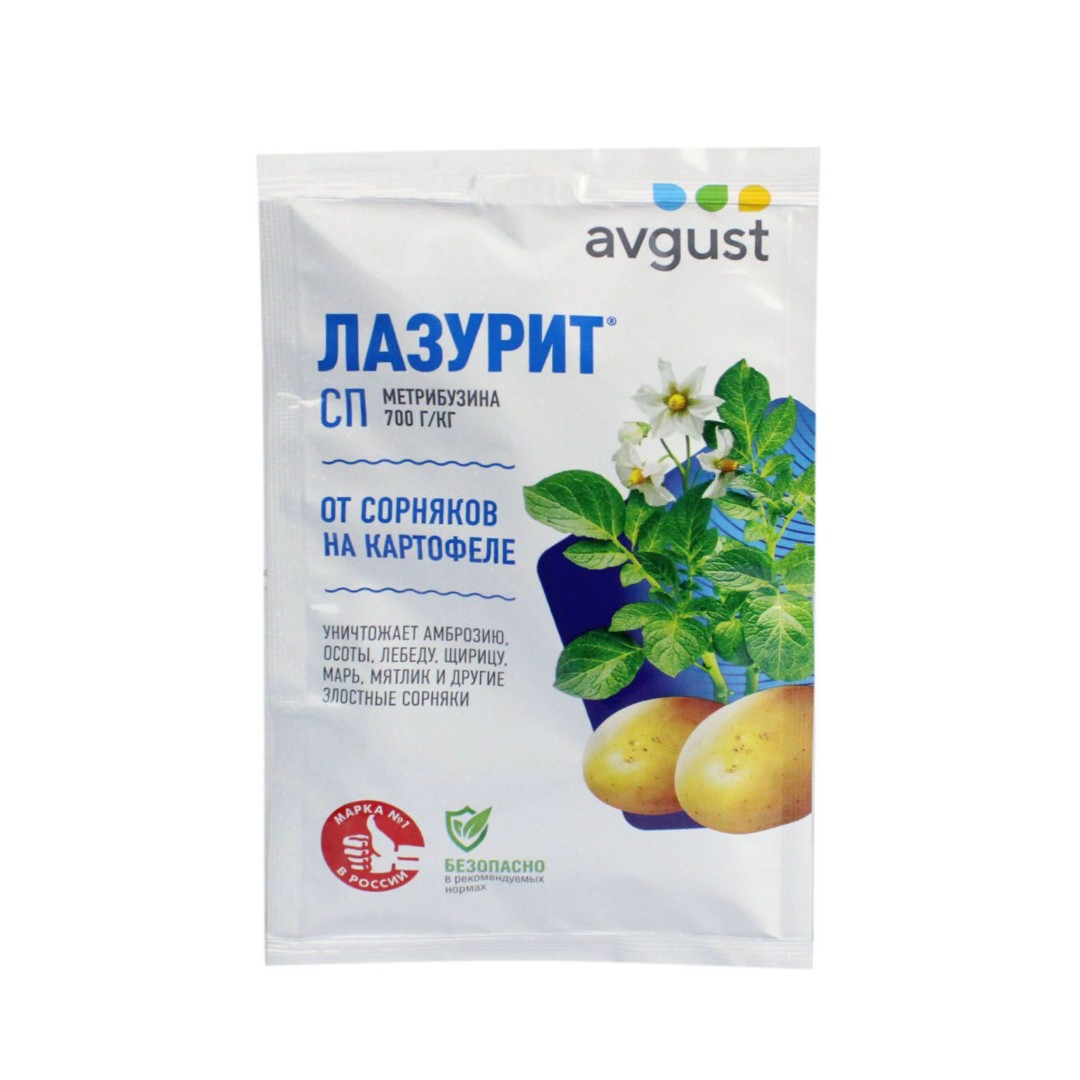 Его особенность в том, что он избирательно уничтожает только сорную растительность, не оказывая отрицательного воздействия на картофель. Первую обработку можно проводить сразу после посадки клубней, опрыскивая почву раствором препарата из расчета 10 г / 3 л воды. Этого объема хватает на 1 сотку. Обладая почвенной активностью, препарат поглощается преимущественно корнями, но может проникать и через листья. Именно это позволяет ему уничтожать не только вегетирующие сорняки, но и подавлять их проростки в почве, препятствуя появлению второй «волны» сорняков, даже таких злостных, как лебеда, марь, амброзия, бодяк, щирица и др. Обработку Лазуритом можно проводить и по проросшему картофелю, но при высоте ботвы до 5 см.
